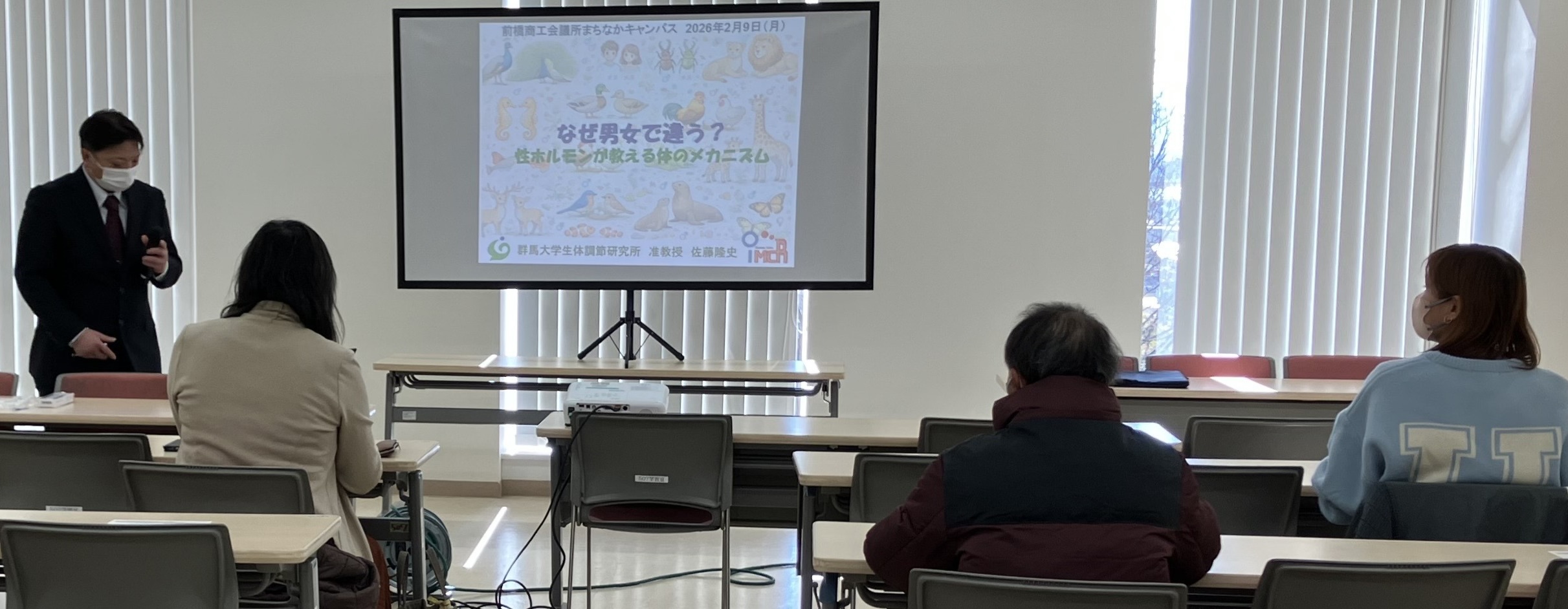 2026年2月9日(月)「まちなかキャンパス 群馬大学生体調節研究所シリーズ」第5回として、「なぜ男女で違う? ― 性ホルモンが教える体のメカニズム」と題し、佐藤隆史 准教授による講演が行われました。今回は、男女の性が分かれる仕組みから、男女差を調節するホルモンの働きやその関連疾患、ドーピングや環境ホルモンに至るまで、 専門的研究と身近な生活との接点を中心にわかりやすく説明されました。参加者の皆さまは終始熱心に聴講されており、質問も多く寄せられる盛況な回となりました。